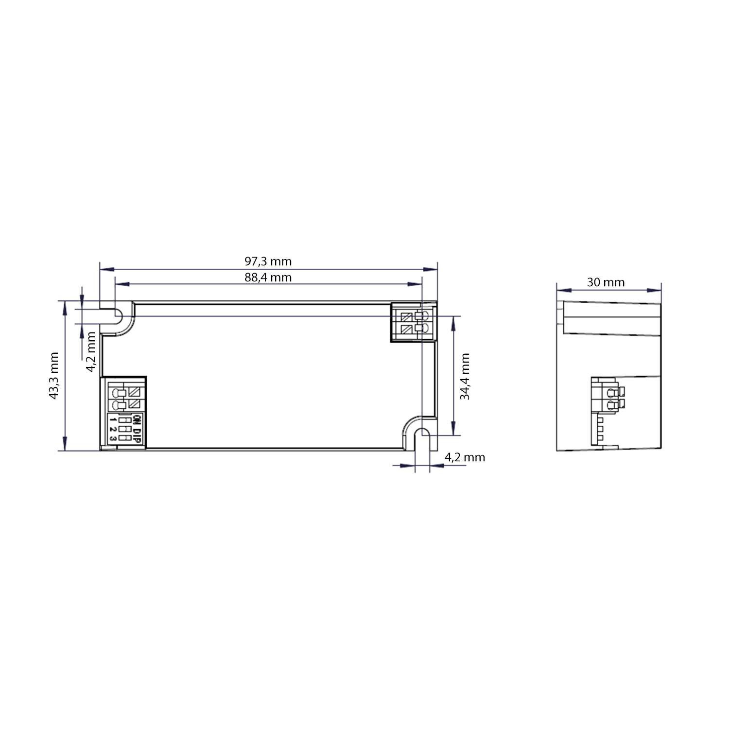 Abmessungen (L × B × H): 97,3 × 43,3 × 30 mm